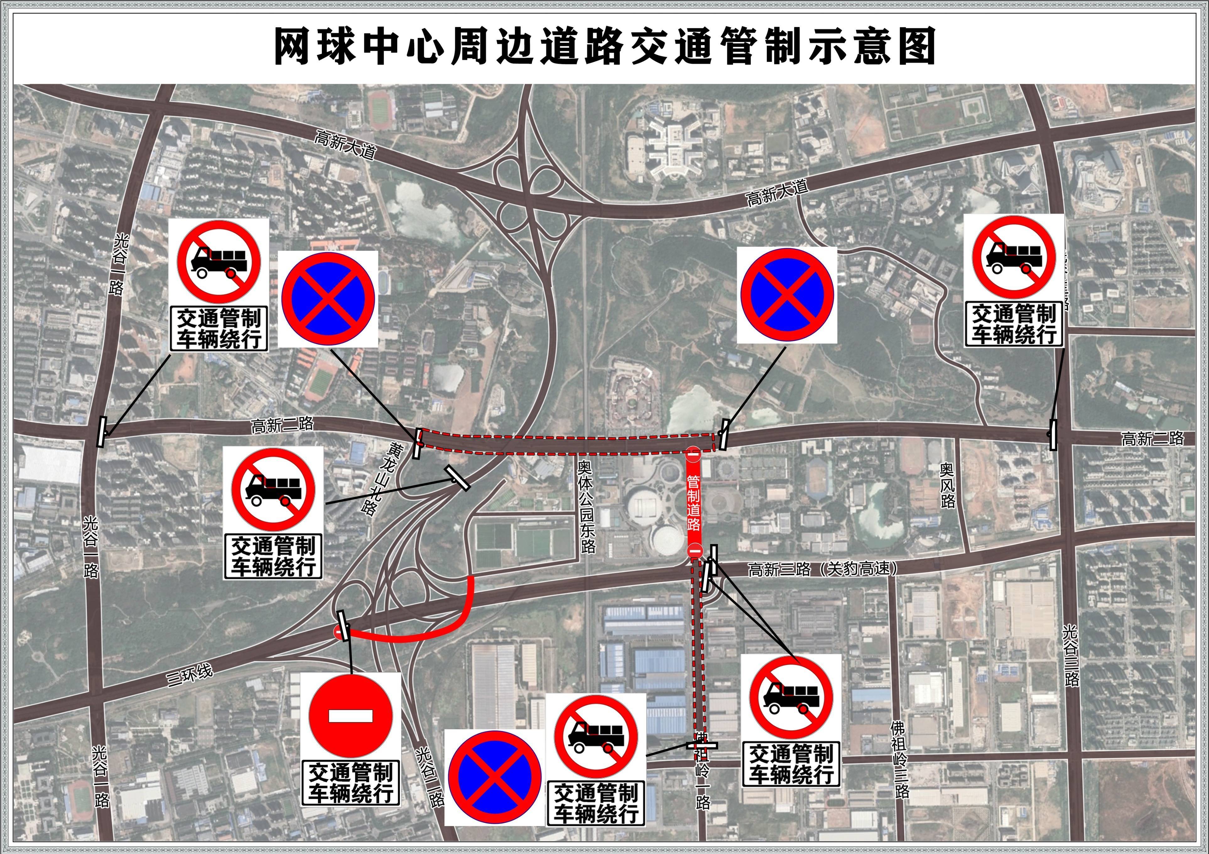 (2)关豹高速佛祖岭一路立交往网球中心匝道采取临时交通管控措施,禁止车辆通行。